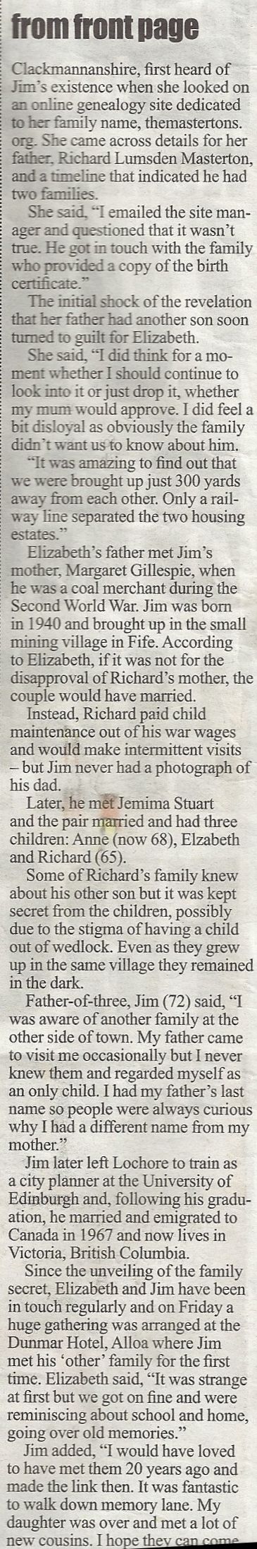 Richard Lumsden Masterton was the father of four and siblings had lost contact with each other until re-united through information found on this website. The article below, from the Scottish Newspaper, The Sunday Post on 18th August 2013 provides further details of the circumstances.